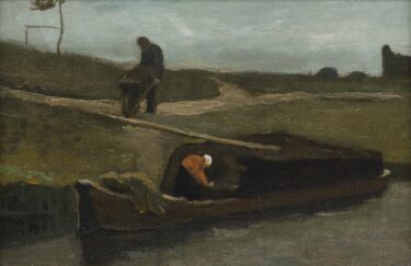 Van Gogh painted De Turfschuit quickly, with a broad brush and a palette knife. First the cream-coloured underlayer, after which he added the figures. Then he painted the land with the peat heaps and the contours of something that looks like a peat hut. After that he did the water and the barge. The air came last. Satisfied, Van Gogh writes: As I paint, I believe I am learning to paint a little better’. It is in Drenthe that he realizes that it is his calling to become an artist.