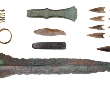At the time it was buried, swords had only just been invented. They were the first objects made for the sole purpose of killing people. The grave also contained an axe (2), gold hair jewellery, a fire striker (5) and splendid flint arrowheads (6). Apparently it was not a problem to acquire beautiful objects.