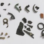 Here you can feel a replica of a Roman helmet. The small metal fragments in the display case on the left in front of you are the remnants of such a helmet. They were part of the uniform of a Roman soldier. They come from the grave of a cavalryman.