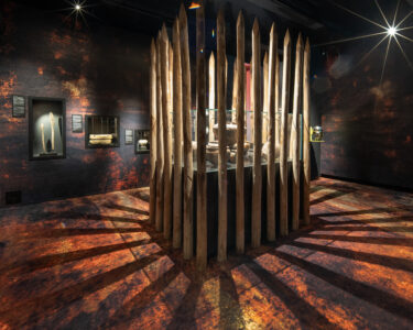 In the room next door there is a large round platform. On its sloping surface, inside a display case, lies the dried-out body of the girl of Yde. After lying in the peat for two thousand years, her body was found on 12 May 1897 by Willem Emmens and Hendrik Barkhof. The cloak that was found with the body could be an indication of her status: cloaks were valuable garments at the time and the fact that it was left lying in the peat with her suggests that she had a certain status or that her sacrifice had a special meaning.