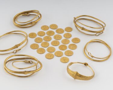 Waarom de ringen zijn opgerold, weten we niet. Zijn ze met opzet onbruikbaar gemaakt of verbogen omdat ze anders niet in een pot of buidel pasten? De gouden ‘solidi’, munten geslagen tussen 364 en 408, hebben mooie stempels. Op dezelfde plek zijn eerder ook munten gevonden uit een andere schat. Die was waarschijnlijk nog groter!