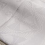 Voor je hangt een wit servet uit de collectie. Het is gemaakt van damast, dat is linnen. Je mag eraan voelen. Het servet is geweven. Door op verschillende manieren te weven, ontstaat een tekening in de stof. Het zorgt voor een subtiel schaduwspel als je het servet door je vingers beweegt. Langs de rand van het servet is een patroon van vlinders geweven. De vlinders hebben een driehoekige vorm, die steeds gedraaid wordt waardoor de vlinders de ene keer met de kop en de andere keer met de staart naar de rand wijzen. Op elke zijde zijn vijf vlinders afgebeeld. In het midden van het servet staan bloemachtige, bijna vierkante vormen. Deze staan in drie rijen van drie en vormen daarmee een vierkant. Om de bloemen heen is een raster gemaakt van kleinere ronde bloemetjes.