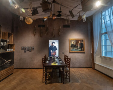 Voor je staat een brandewijnkom, deze mag je aanraken. De antieke zilveren kom lijkt op het exemplaar uit onze collectie dat in de vitrine te zien is. Daar staat de kom naast een suikerstrooilepel, kandijpot, roomkom, roomlepel en kandijschaaltje. Deze Friese brandewijnkom is 25 bij 12 centimeter en 8 centimeter diep, dus ovaalvormig. De kom heeft een voet en aan de bovenrand twee platte horizontale handvatten. Het geheel is rijkelijk versierd met organische vormen. De versieringen zijn aangebracht door deze aan de binnenkant naar buiten de tikken met behulp van verschillende ponsjes en een hamer. Je kunt dit goed voelen.